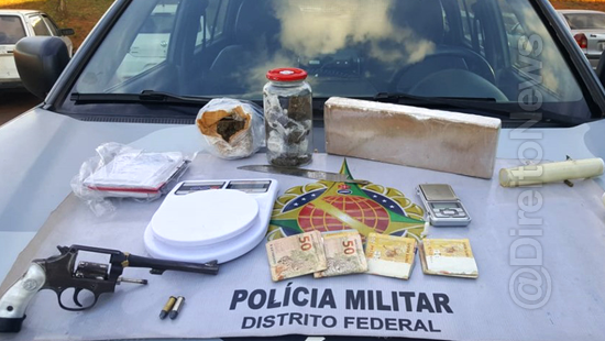 Dentro da casa, na QR 123 de Samambaia, a PM encontrou um tijolo de maconha, um pino de cocaína, uma porção de haxixe, duas balanças de precisão, além de uma arma calibre 32 e munição. A mulher testemunhou toda a busca e se propôs a testemunhar na delegacia.