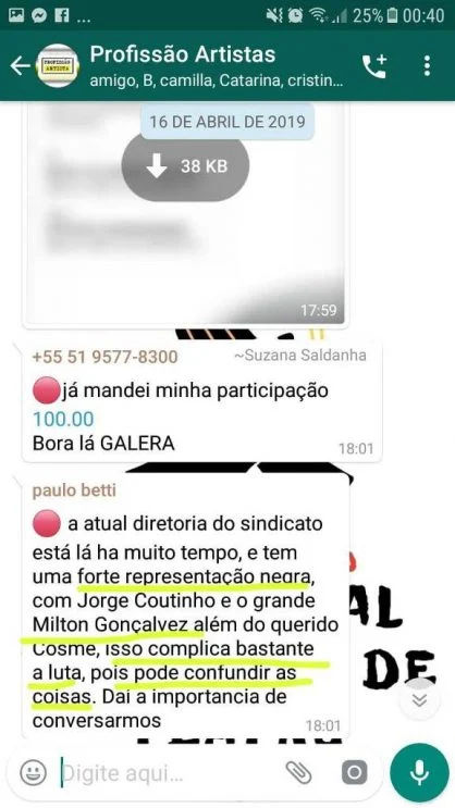 Betti enviou no grupo “Profissão Artistas” no dia 16 de abril deste ano, a seguinte mensagem: “A atual diretoria do sindicato está lá há muito tempo e tem uma forte representação negra com Jorge Coutinho e o grande Milton Gonçalves, além do querido Cosme, isso complica bastante a luta, pois pode confundir as coisas”.