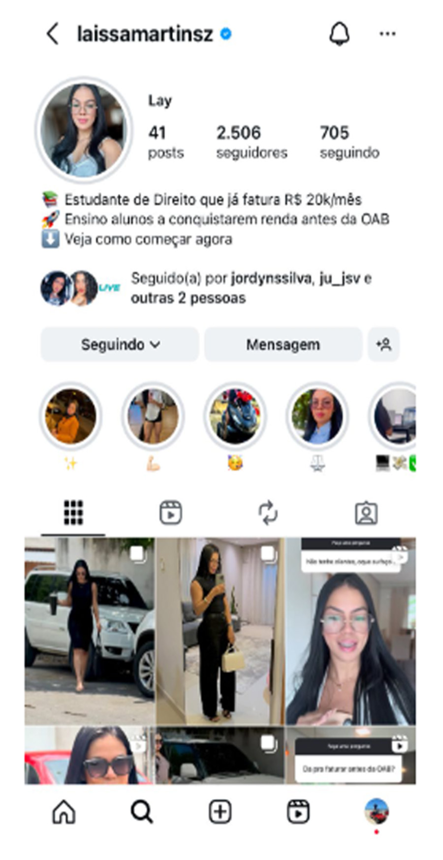 | Perfil de Laíssa no Instagram: estudante ensina alunos a ganhar dinheiro antes de obter registro na OAB (Imagem: Instagram/Reprodução) |