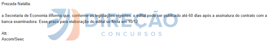 De acordo com a assessoria de imprensa, a legislação vigente estabelece um prazo de até 60 dias após a assinatura do contrato com a banca examinadora para que o edital seja publicado. Considerando que o contrato com o Cebraspe foi formalizado no dia 31 de outubro, a data limite para a divulgação do documento seria 30 de dezembro.