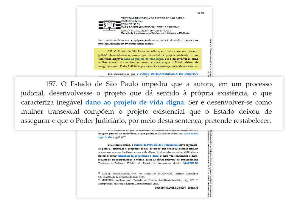 A sentença também citou precedentes da Corte Interamericana de Direitos Humanos sobre o conceito de "projeto de vida", concluindo que a atuação do Estado comprometeu o desenvolvimento existencial digno da autora ao negar sua identidade justamente em um processo relacionado à sua saúde e afirmação corporal.